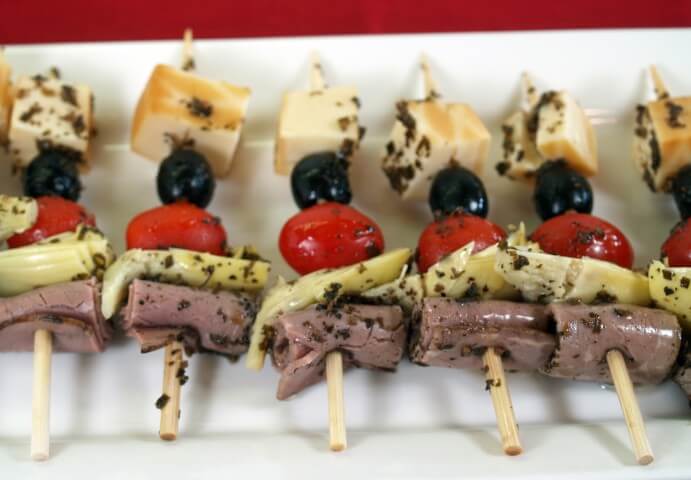 These skewers are no wimps! They are beefed up literally with your favorite beef, tomatoes, provolone and the ever-so-tangy artichoke. Drizzle with Italian dressing and you have one inviting kabob.