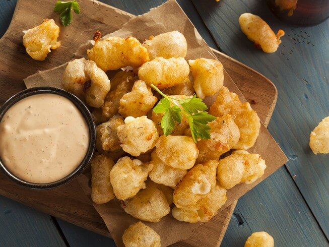 Deep-fried cheese curds are a hallmark food at midwest state fairs. Cheese curds can be found in the cheese or deli section at larger grocery stores.