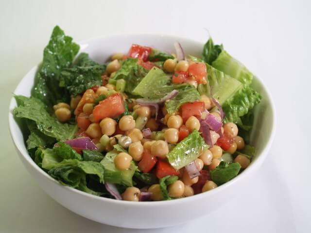 Garbanzo beans, green onion, red onion, and chopped tomatoes are tossed with a simple white wine vinegar dressing.