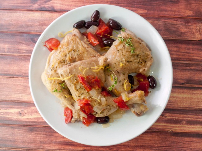 This tender braised chicken has delicious Mediterranean flavors with the addition of tomatoes, lemon, and olives.