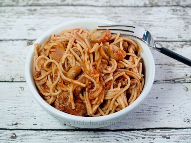A tasty and easy crock pot spaghetti recipe made with ground beef, spaghetti pasta, onion, garlic, tomato sauce, mushrooms, tomato sauce, and V8 juice.
