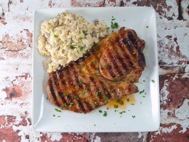 Pork steaks are grilled after marinating overnight in a homemade teriyaki sauce