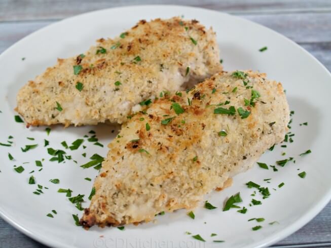 Tender chicken breasts are baked with a light and crispy ranch-breadcrumb coating.