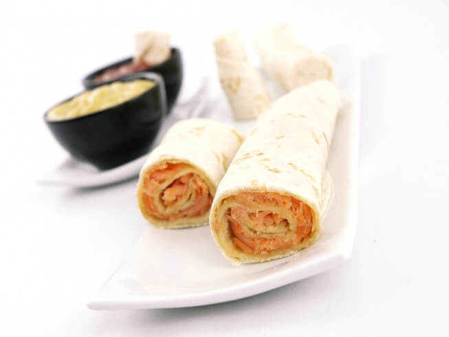 Perfect as a snack, lunch, or party appetizer. Smoked salmon is mixed with soft herb cheese and spread on flour tortillas.