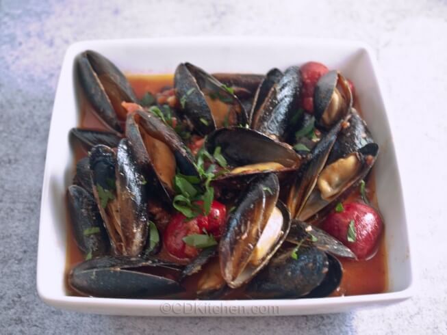 Fresh mussels are simmered in a garlic, white wine and marinara sauce.