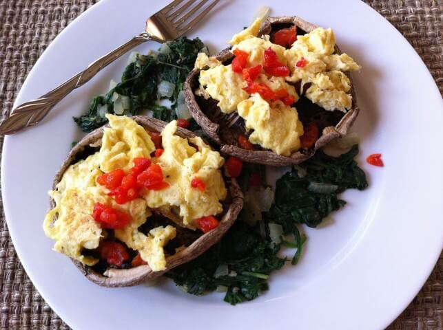 A delicious breakfast made with portobello mushrooms, fresh spinach, roasted red peppers, and scrambled eggs.