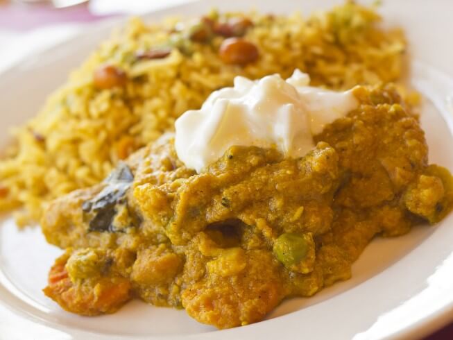 Korma is a non-spicy but very flavorful slow cooked dish. This version contains green beans, cauliflower, and tomatoes cooked in a creamy sauce that is served over rice.