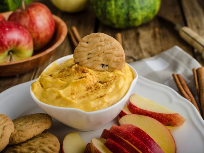 This creamy dip tastes like pumpkin pie. You can substitute fat-free or low-fat cream cheese in it if you wish for a lower fat snack.