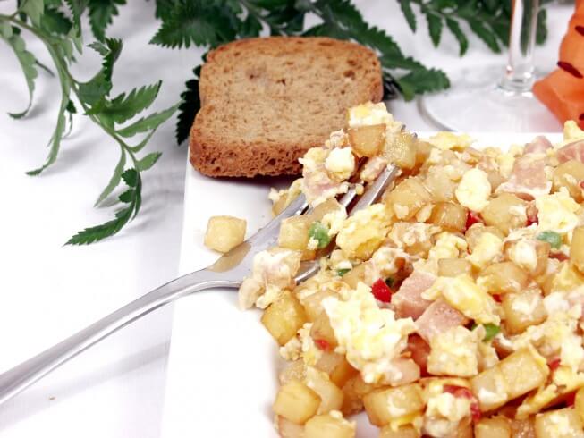 Breakfast can be the most delicious meal of the day too! Ham, peppers, and potatoes give scrambled eggs a hearty and tasty boost. Top with some hot sauce or ketchup if desired.