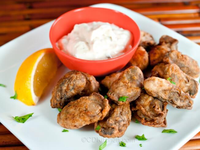 Fresh oysters are covered in a spicy coating and deep fried until golden brown.