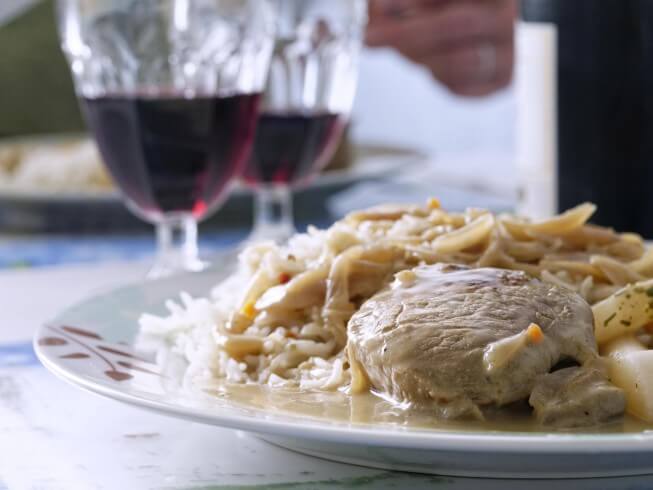 Seasoned pork chops are served in a rich, thick onion gravy.
