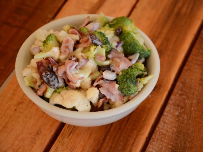 Fresh broccoli and cauliflower are mixed with raisins and sunflower seeds in a creamy dressing to make a side salad that will have everyone requesting the recipe.