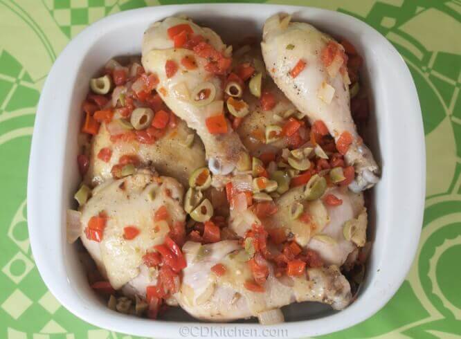 Chicken pieces are simmered with bell pepper, onion, and tomato with a little oregano and chopped green olives for extra flavor.